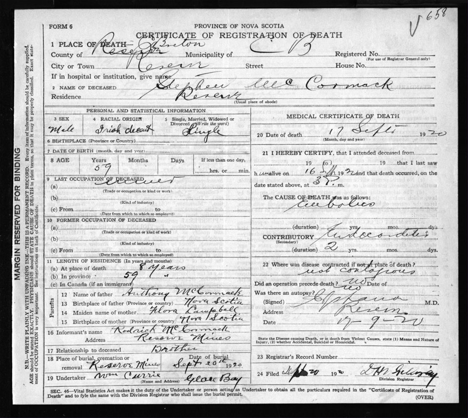 Male Death Registration: Year: 1920 file: 57 number: 658
