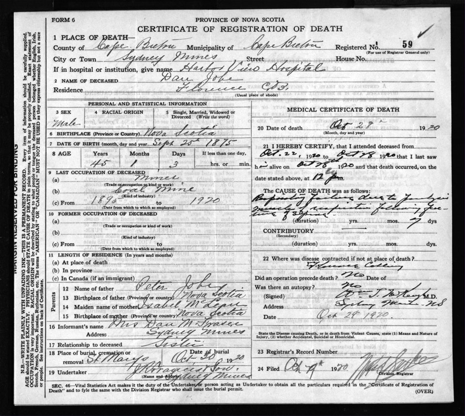 Male Death Registration: Year: 1920 file: 58 number: 59
