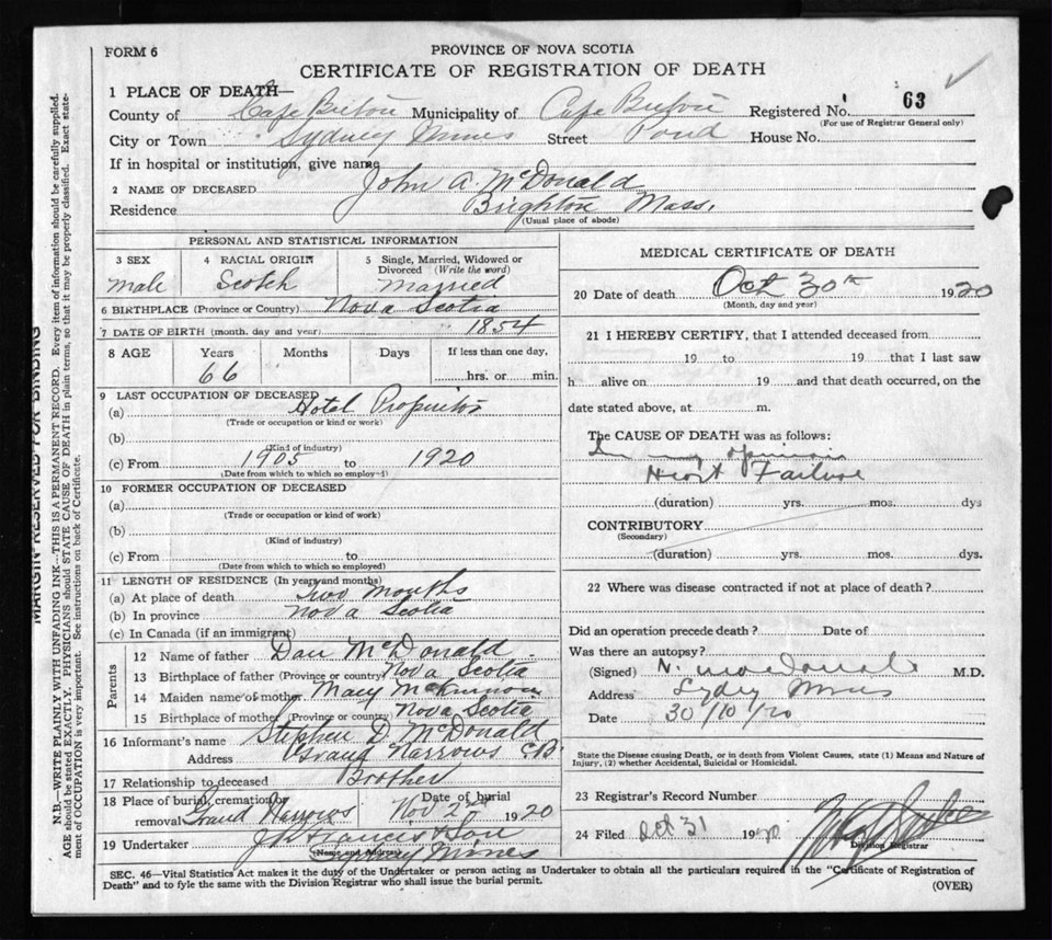 Male Death Registration: Year: 1920 file: 58 number: 63