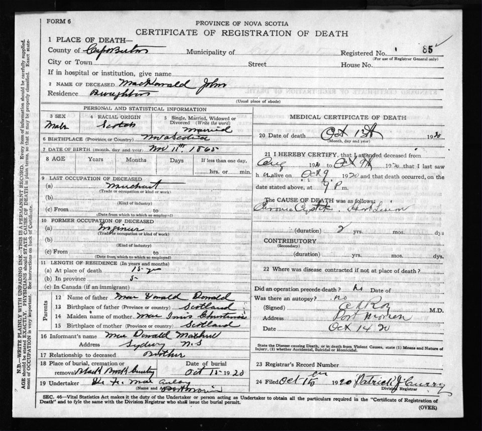 Male Death Registration: Year: 1920 file: 58 number: 85