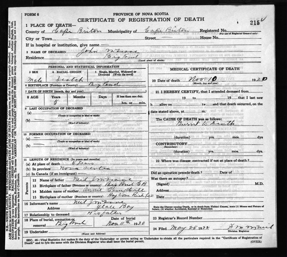 Male Death Registration: Year: 1920 file: 58 number: 215