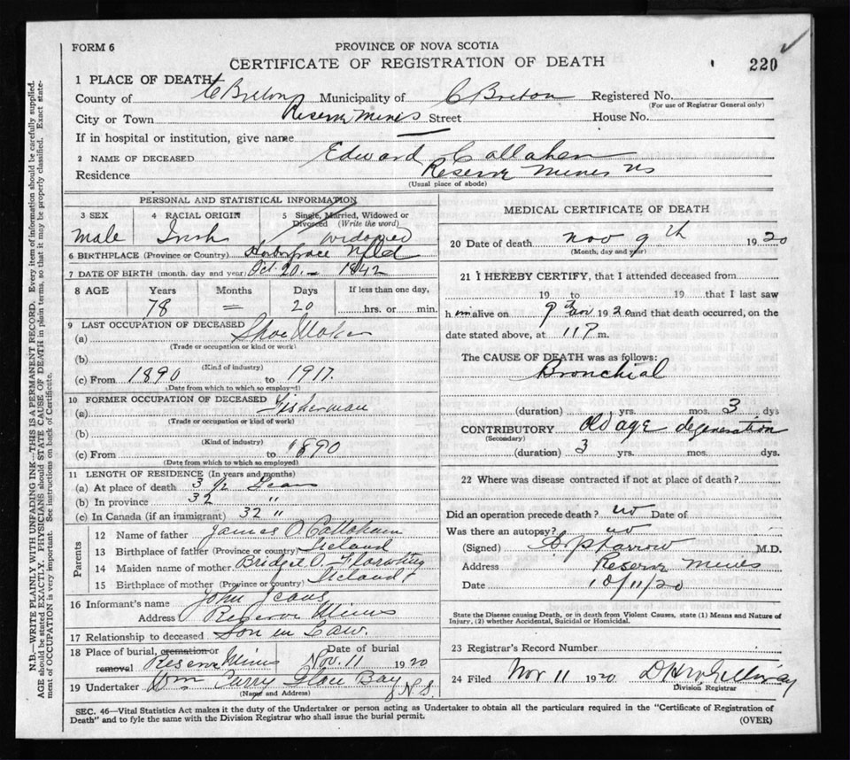 Male Death Registration: Year: 1920 file: 58 number: 220