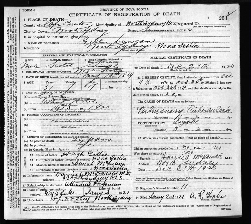 Male Death Registration: Year: 1920 file: 58 number: 251