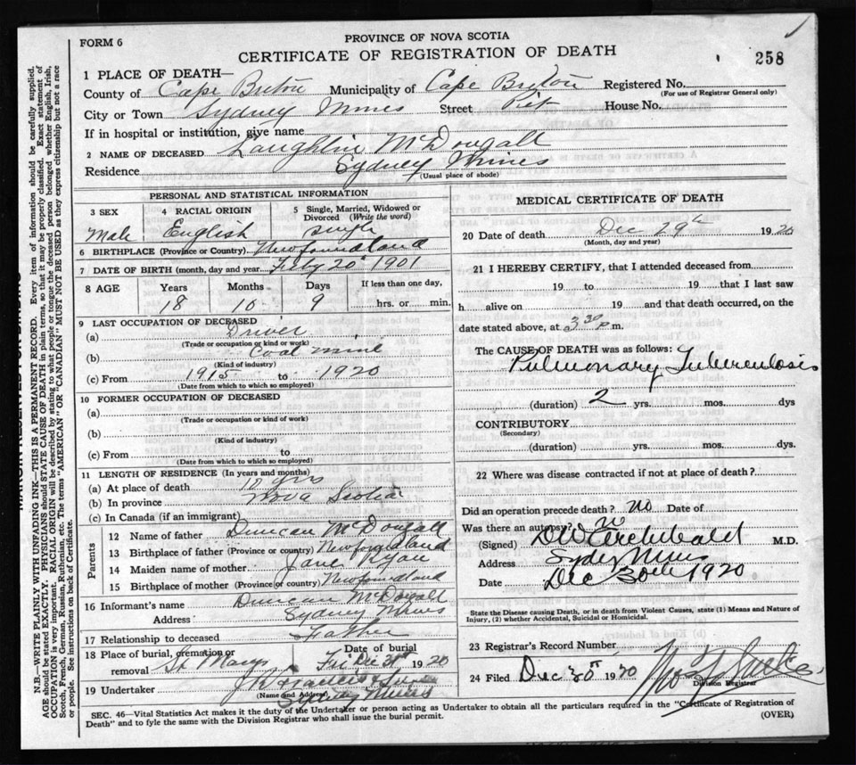 Male Death Registration: Year: 1920 file: 58 number: 258