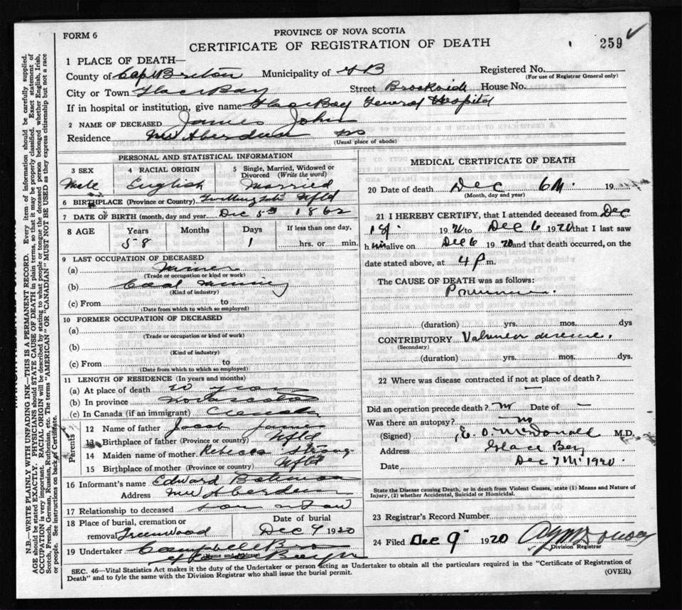 Male Death Registration: Year: 1920 file: 58 number: 259