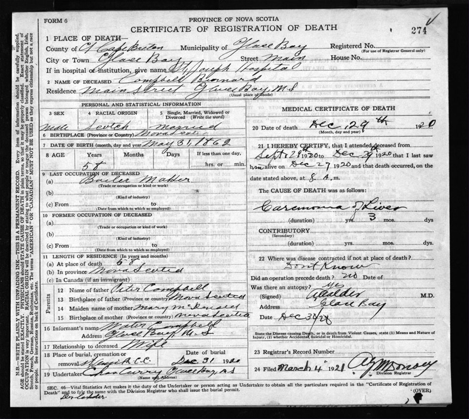 Male Death Registration: Year: 1920 file: 58 number: 274