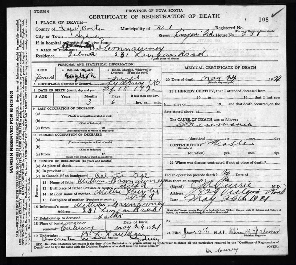 Female Death Registration: Year: 1921 file: 59 number: 108