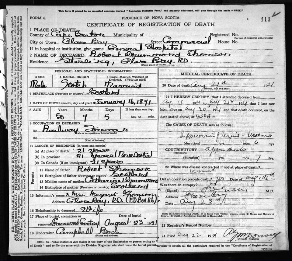 Male Death Registration: Year: 1921 file: 59 number: 413