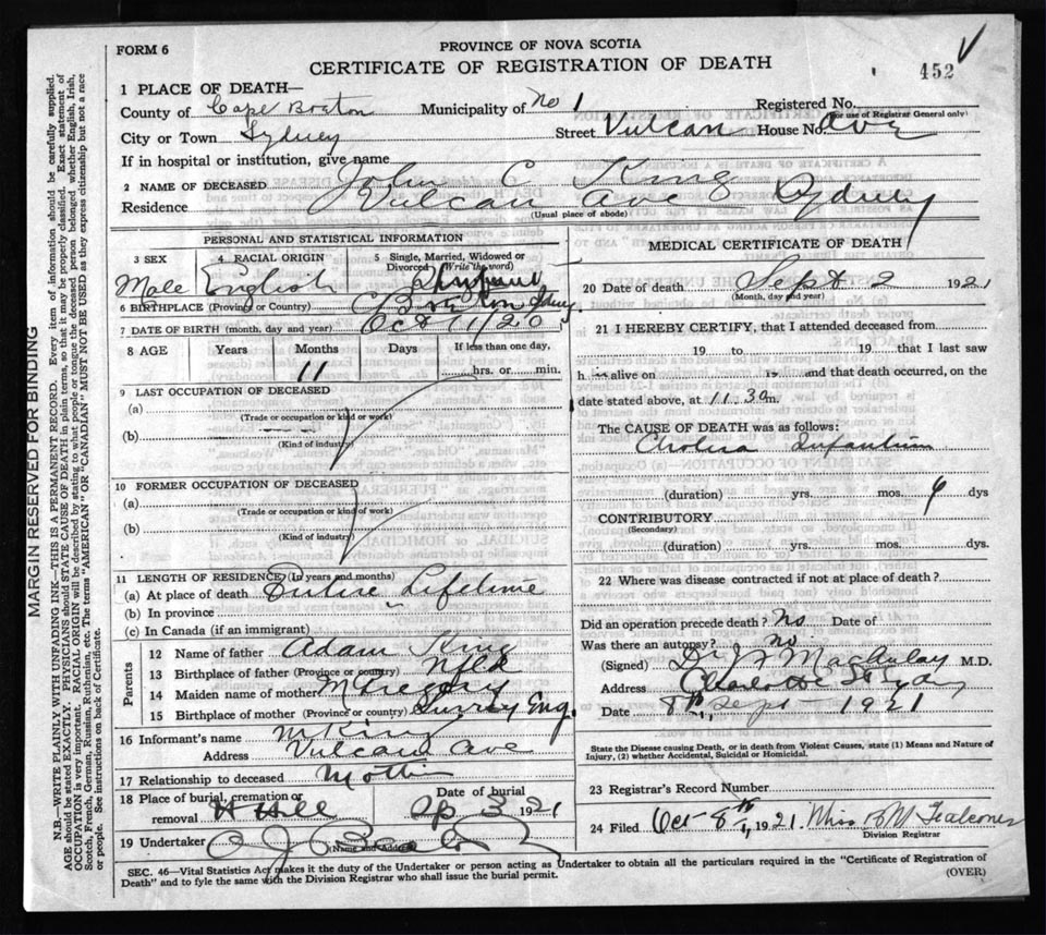 Male Death Registration: Year: 1921 file: 59 number: 452