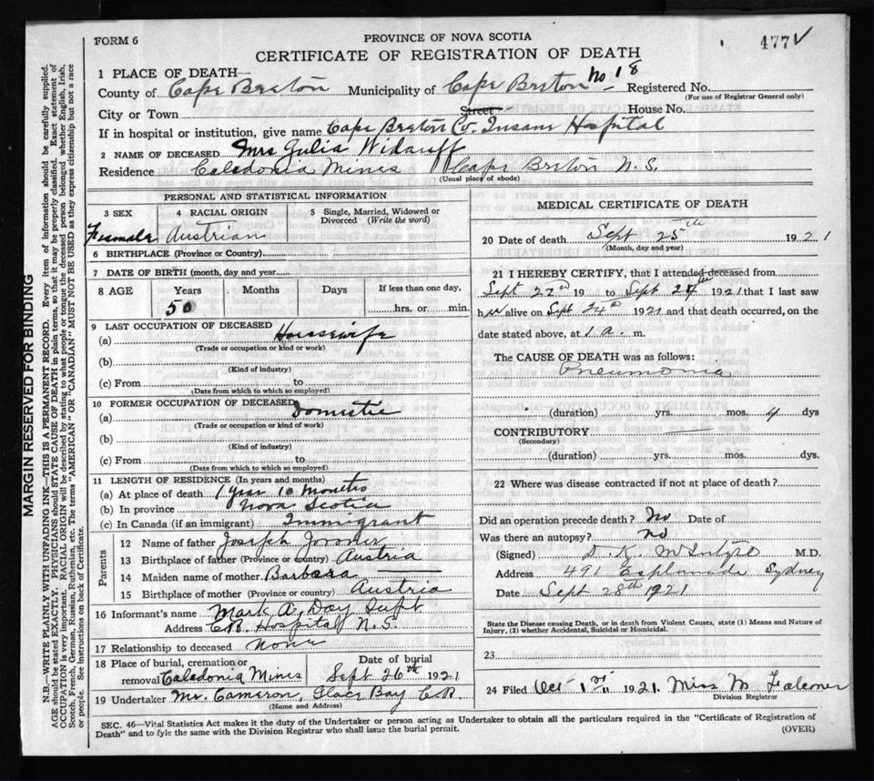 Female Death Registration: Year: 1921 file: 59 number: 477