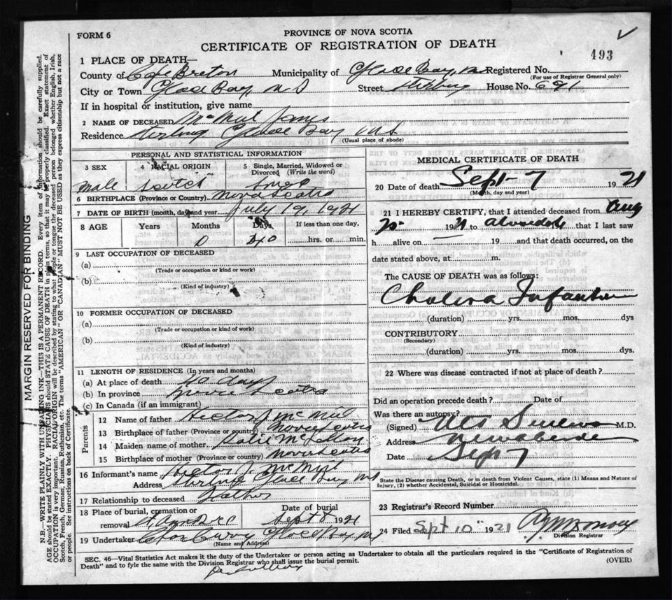Male Death Registration: Year: 1921 file: 59 number: 493