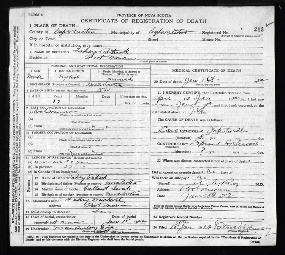 Male Death Registration: Year: 1922 file: 60 number: 243