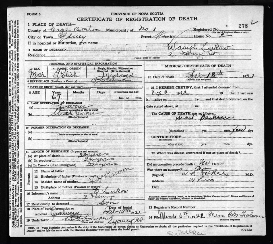 Male Death Registration: Year: 1922 file: 60 number: 276