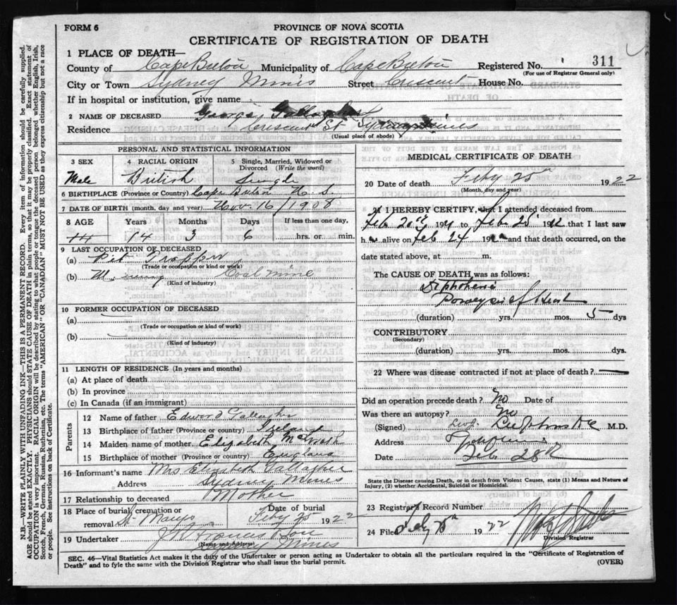 Male Death Registration: Year: 1922 file: 60 number: 311