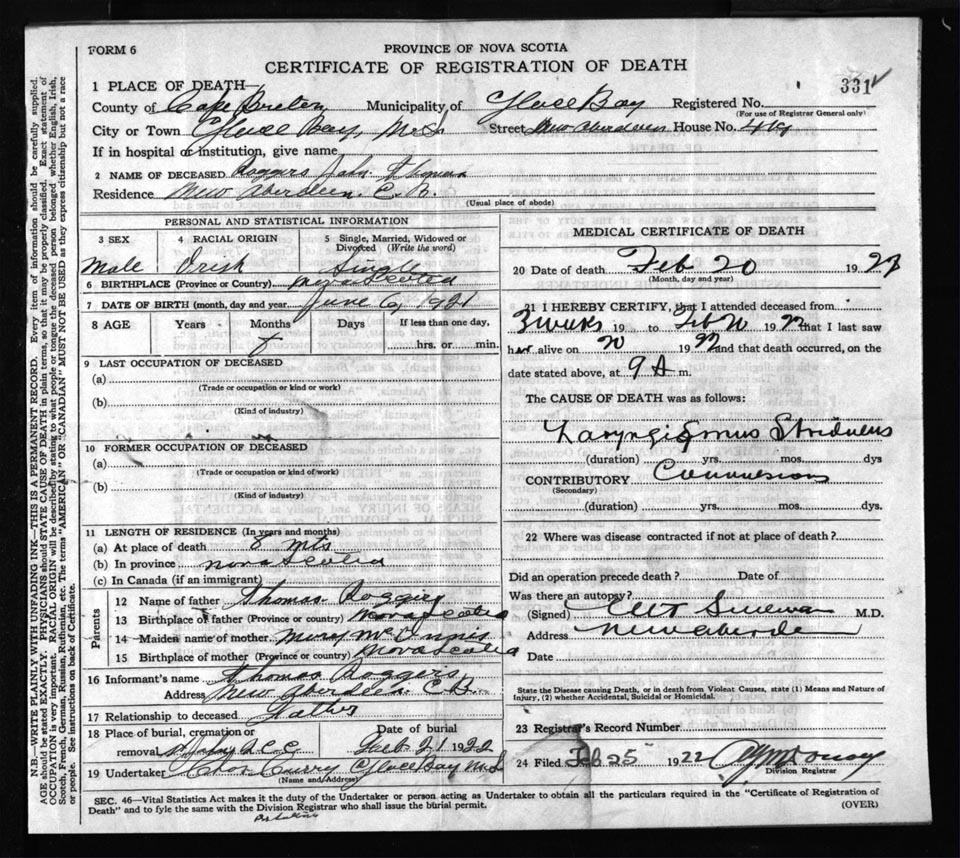 Male Death Registration: Year: 1922 file: 60 number: 331