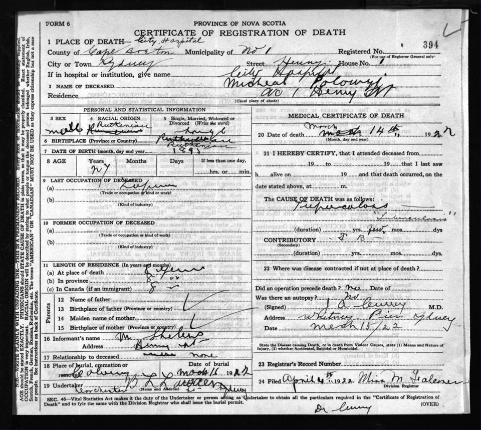 Male Death Registration: Year: 1922 file: 60 number: 394