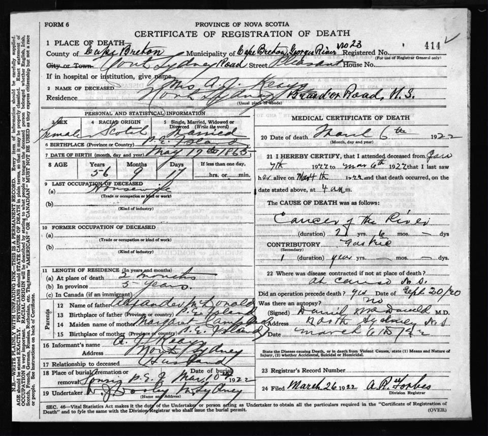 Female Death Registration: Year: 1922 file: 60 number: 414