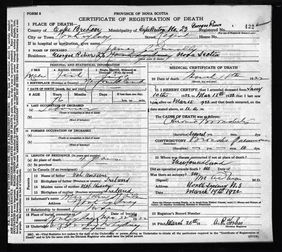 Male Death Registration: Year: 1922 file: 60 number: 422