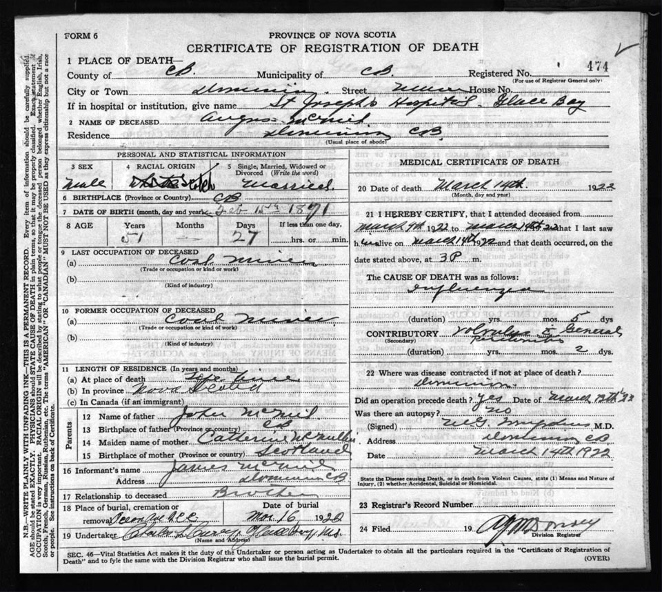 Male Death Registration: Year: 1922 file: 60 number: 474