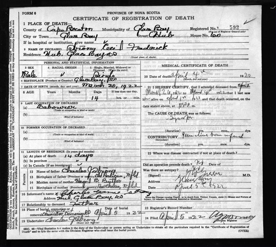 Male Death Registration: Year: 1922 file: 60 number: 592
