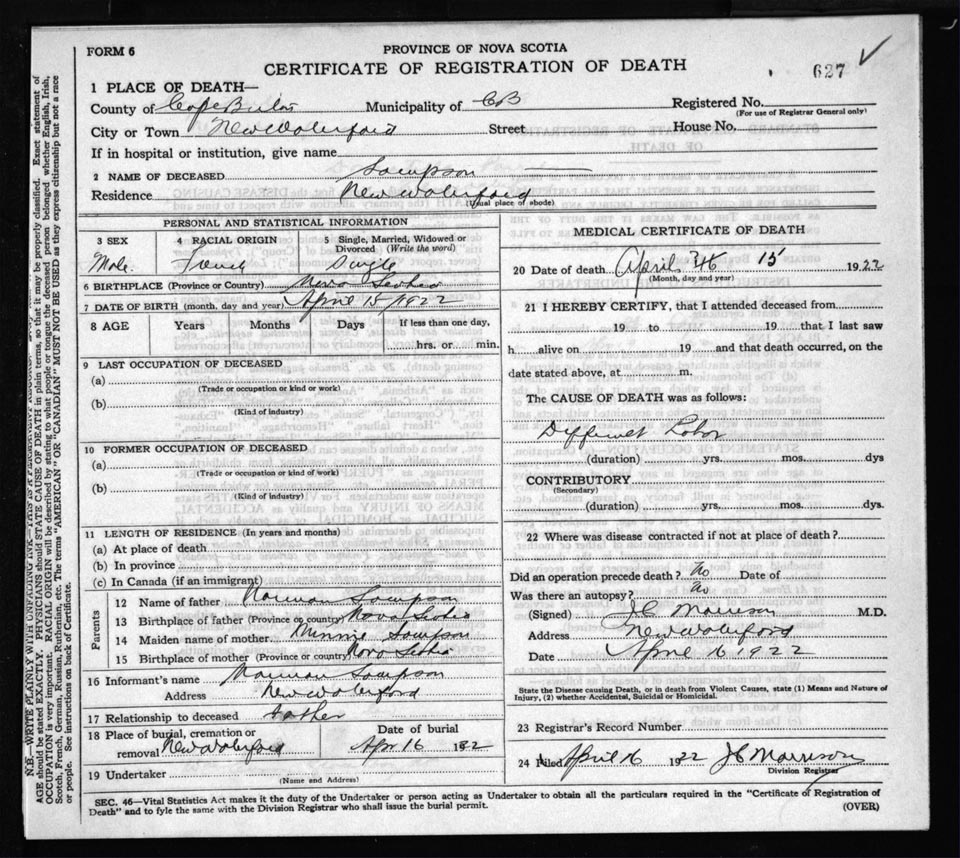Male Death Registration: Year: 1922 file: 60 number: 627
