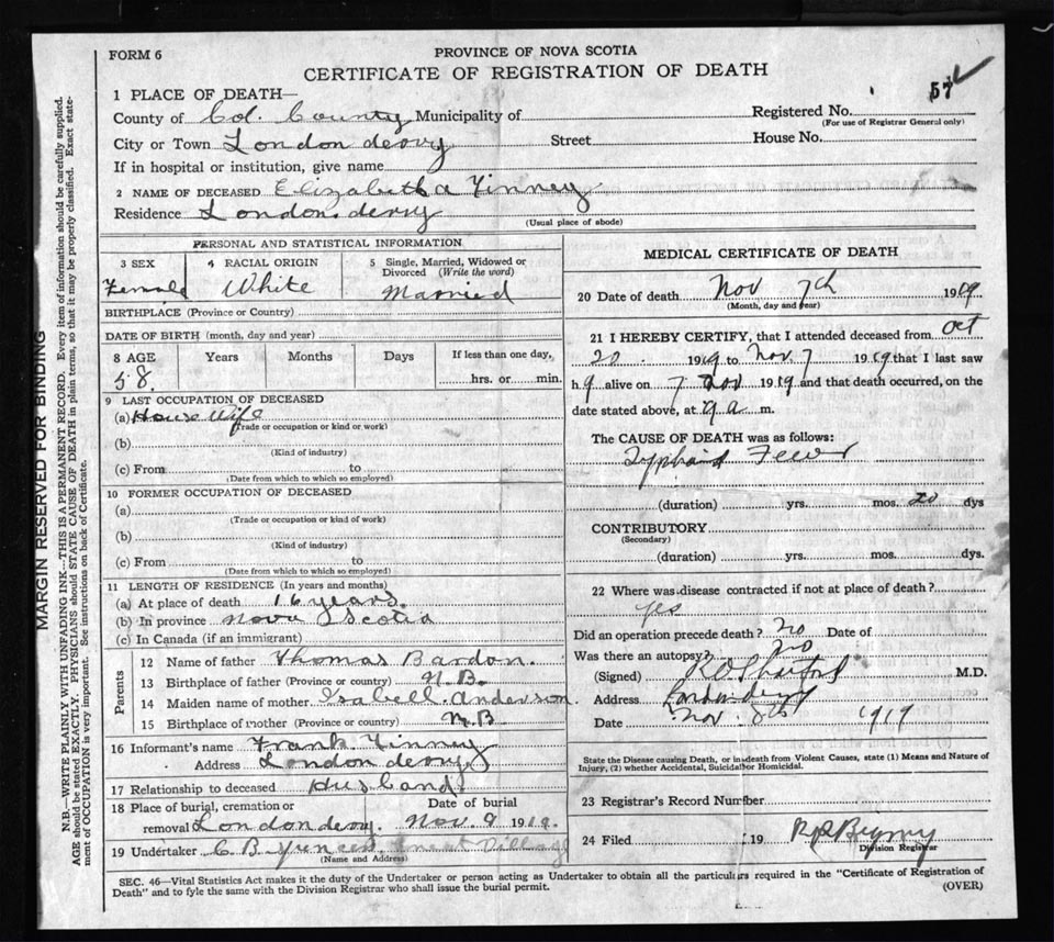 Death Registration: Year: 1919 file: 61 number: 57