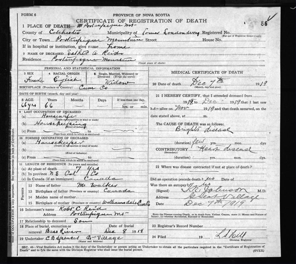 Death Registration: Year: 1919 file: 61 number: 86