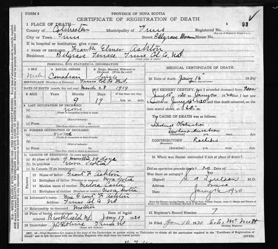 Death Registration: Year: 1920 file: 61 number: 93