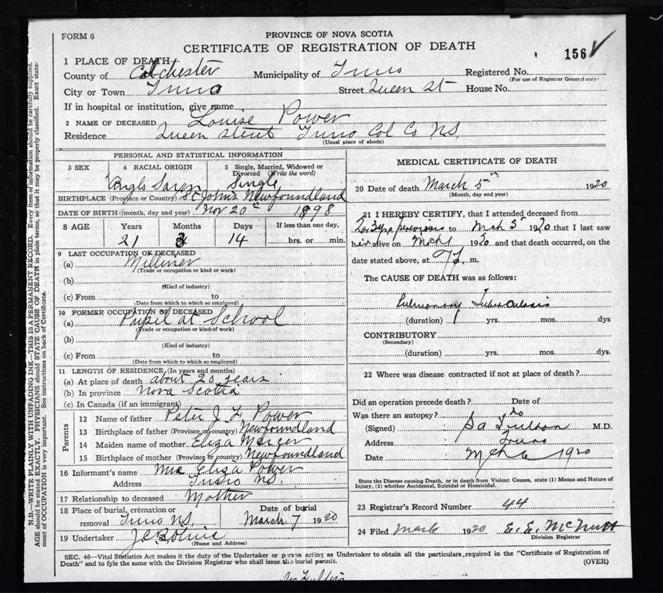 Death Registration: Year: 1920 file: 61 number: 156
