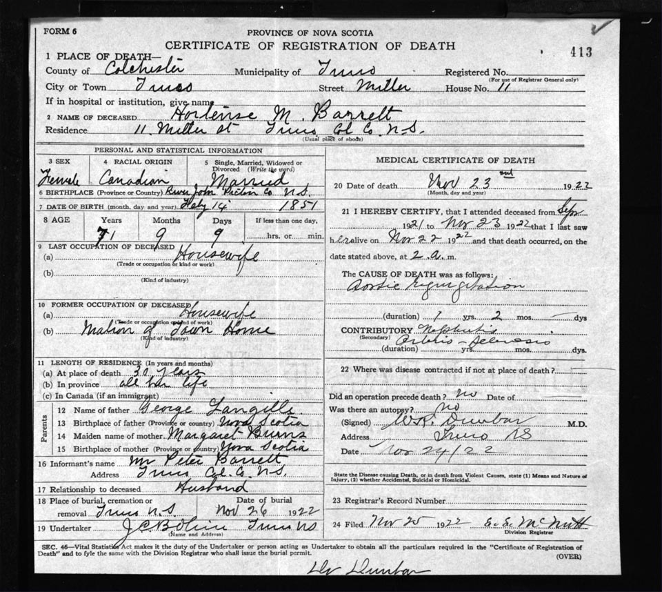Death Registration: Year: 1922 file: 62 number: 413