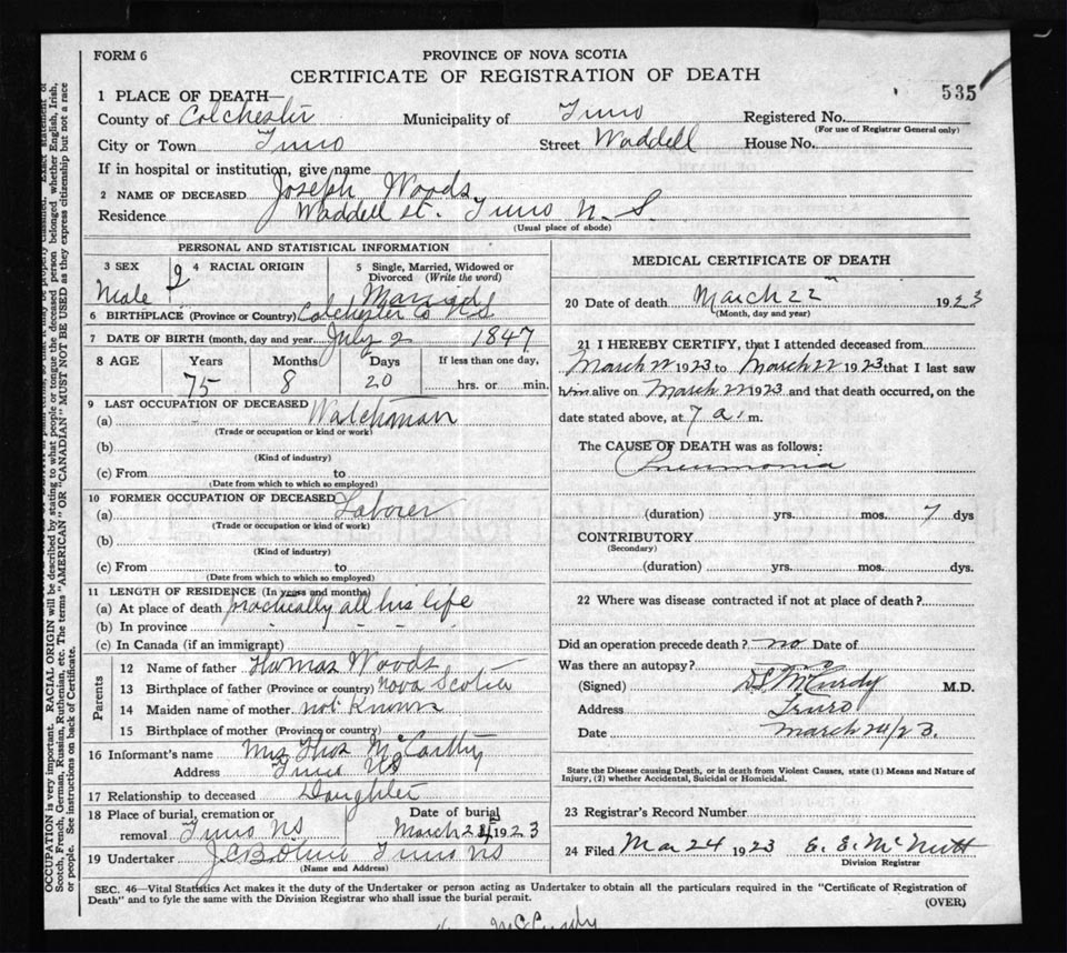 Death Registration: Year: 1923 file: 62 number: 535