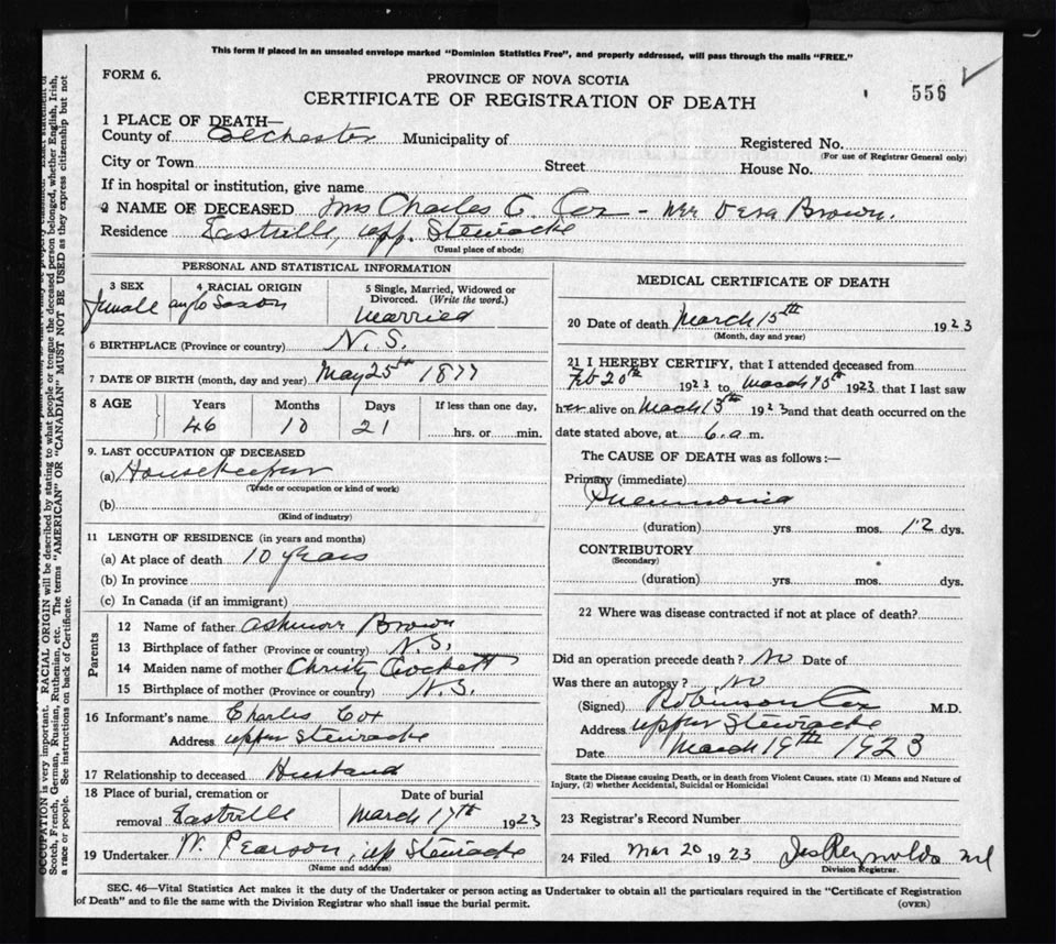 Death Registration: Year: 1923 file: 62 number: 556