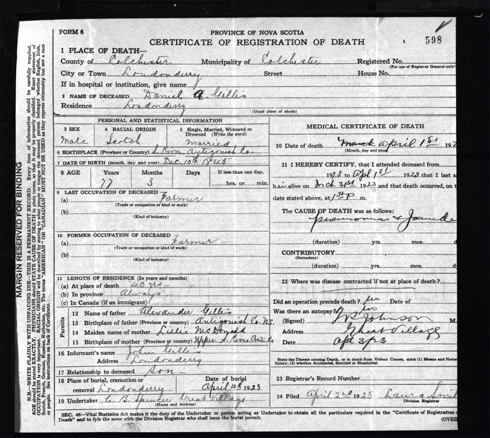 Death Registration: Year: 1923 file: 62 number: 598