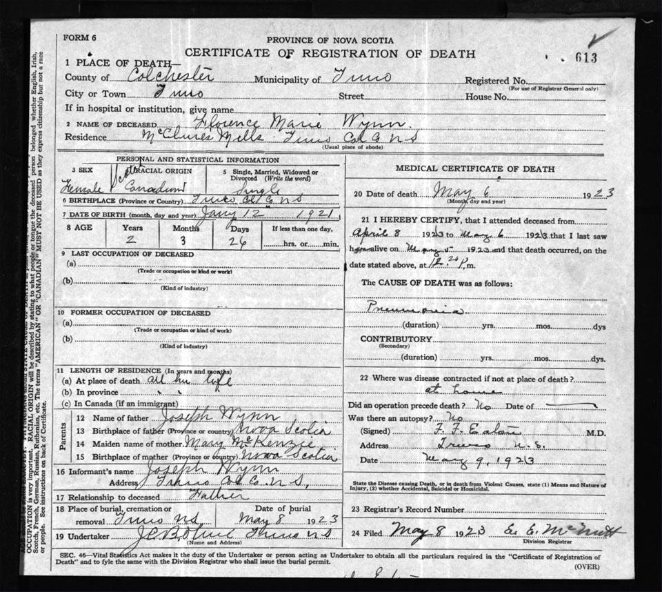 Death Registration: Year: 1923 file: 62 number: 613