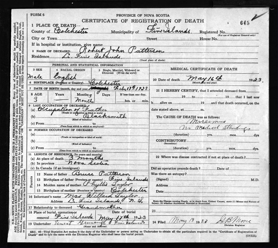 Death Registration: Year: 1923 file: 62 number: 645