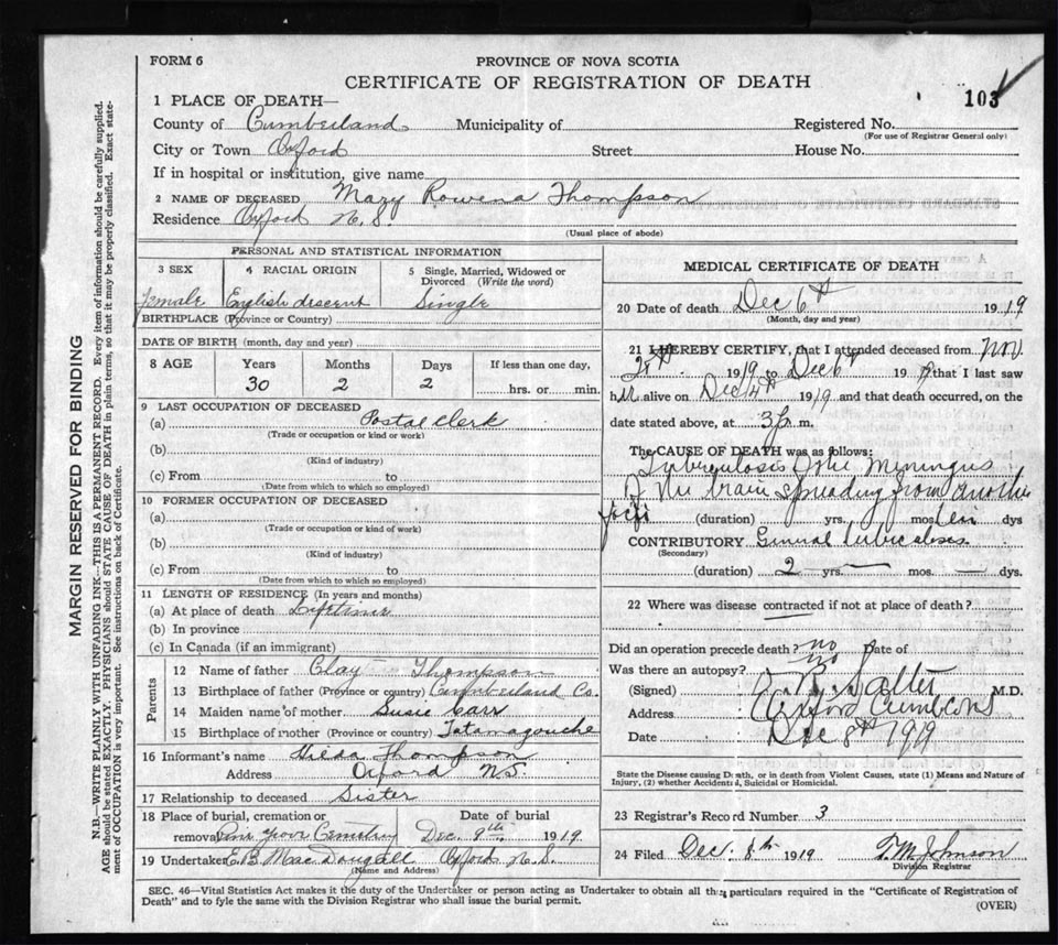 Death Registration: Year: 1919 file: 63 number: 103