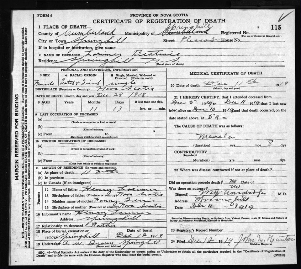 Death Registration: Year: 1919 file: 63 number: 115