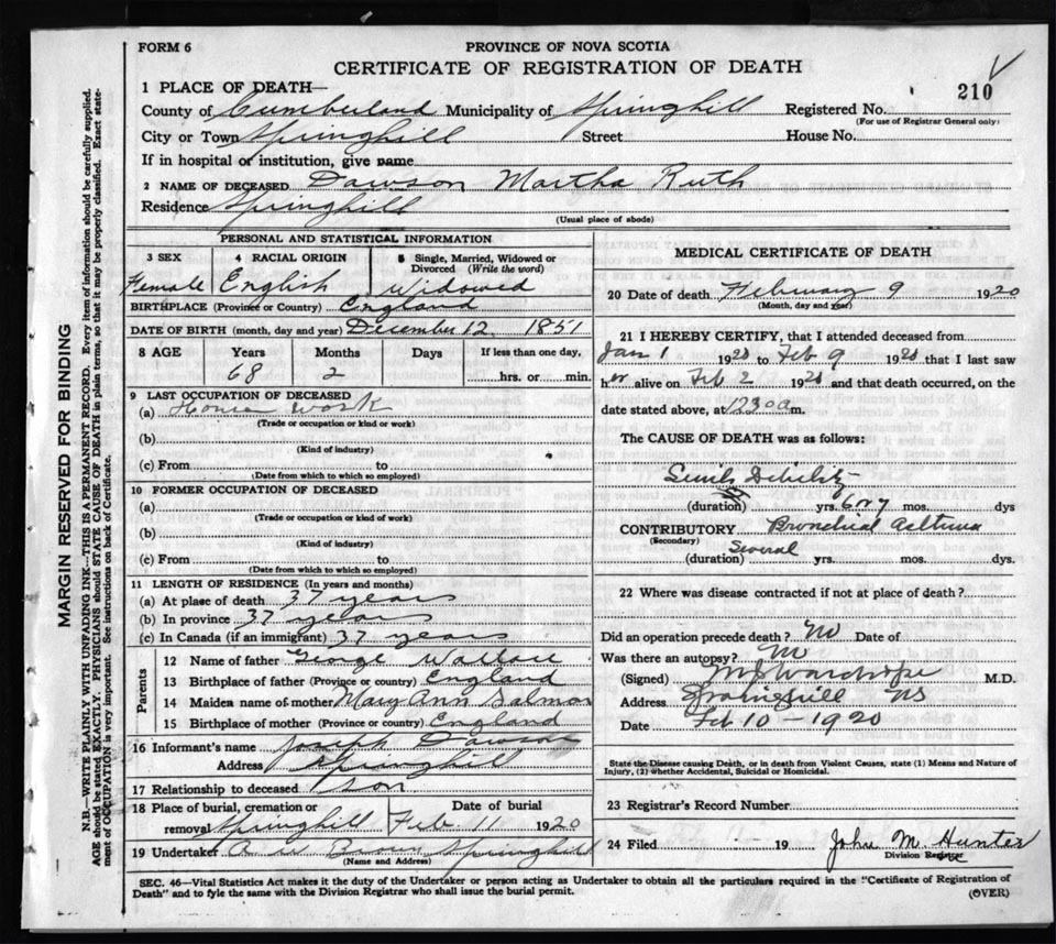 Death Registration: Year: 1920 file: 63 number: 210