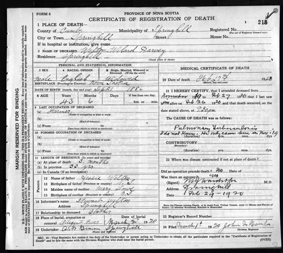 Death Registration: Year: 1920 file: 63 number: 215