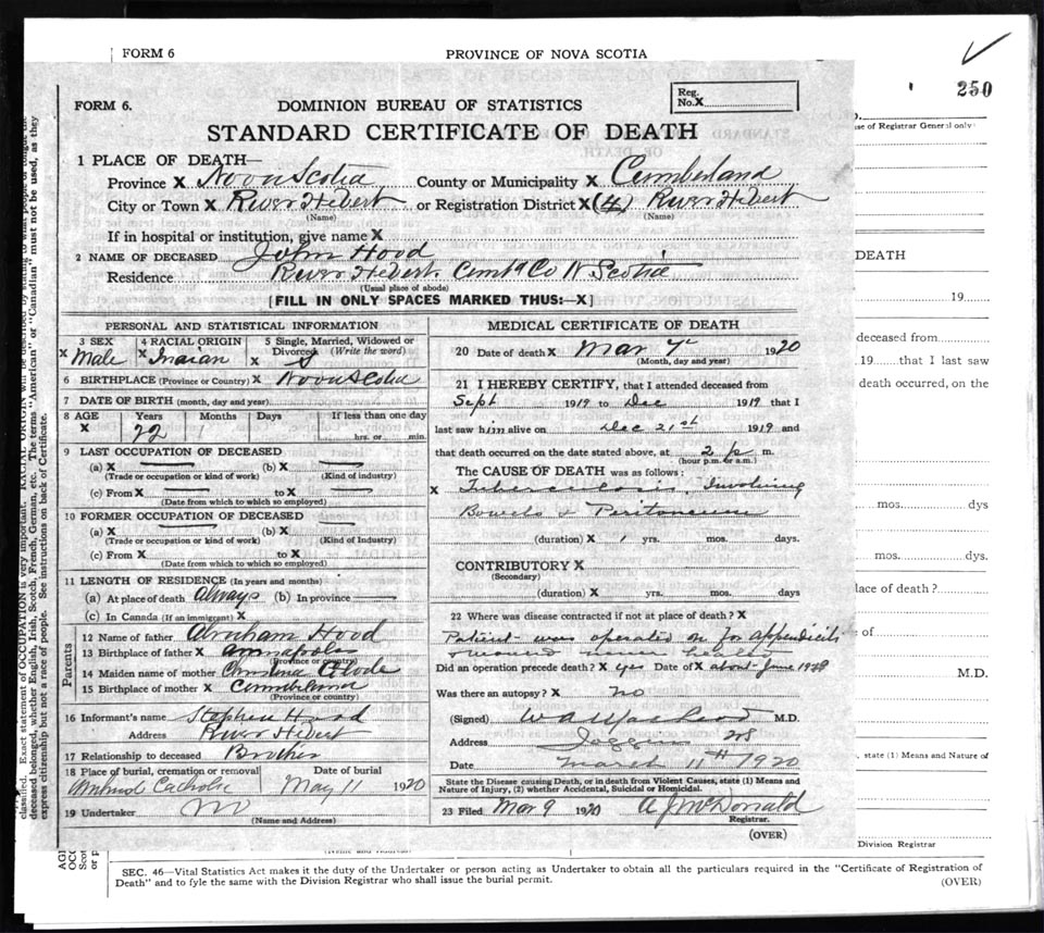 Male Death Registration: Year: 1920 file: 63 number: 250