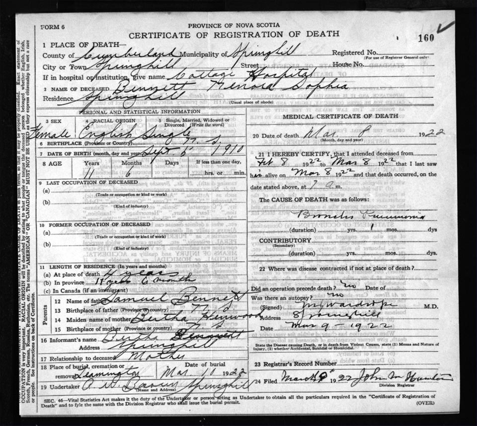 Death Registration: Year: 1922 file: 65 number: 160