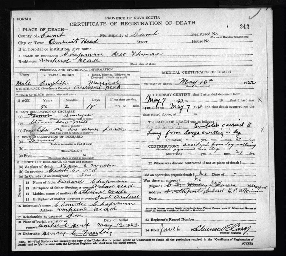 Death Registration: Year: 1922 file: 65 number: 242