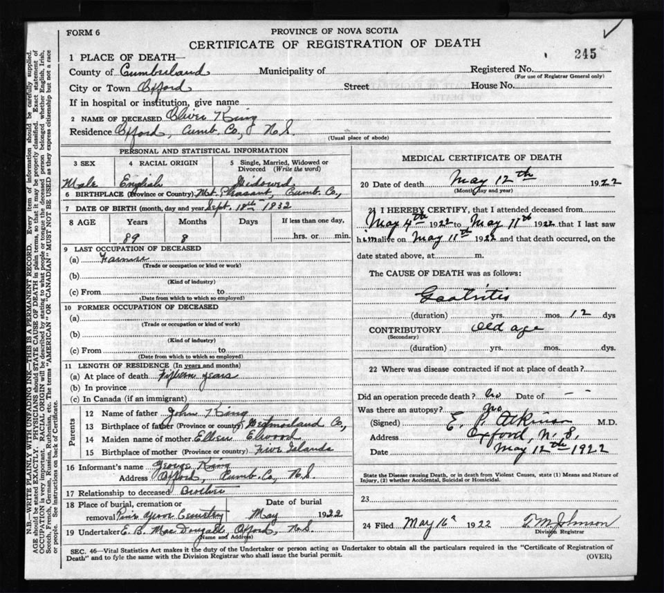 Death Registration: Year: 1922 file: 65 number: 245