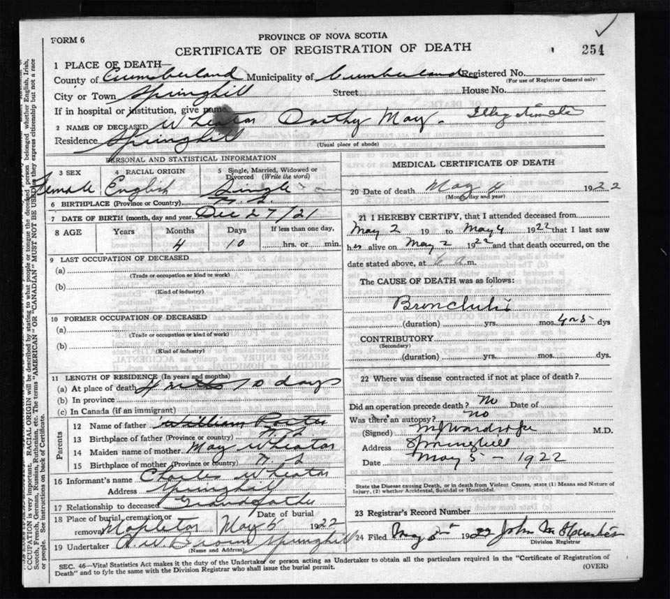 Death Registration: Year: 1922 file: 65 number: 254