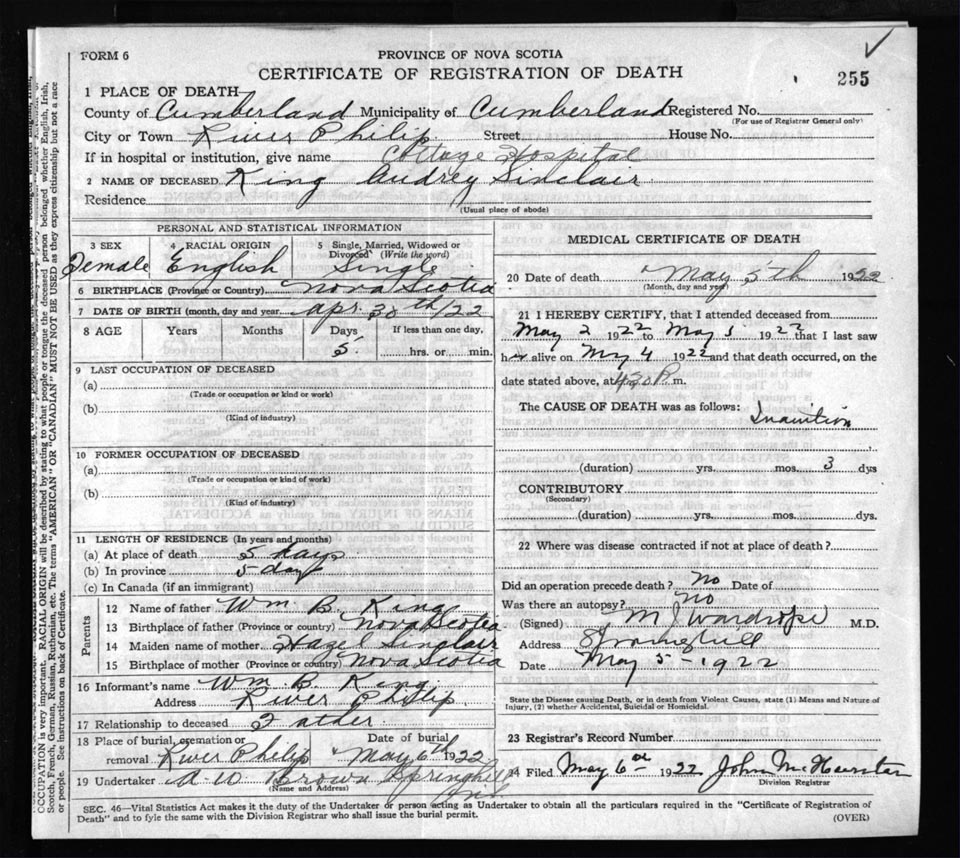 Death Registration: Year: 1922 file: 65 number: 255