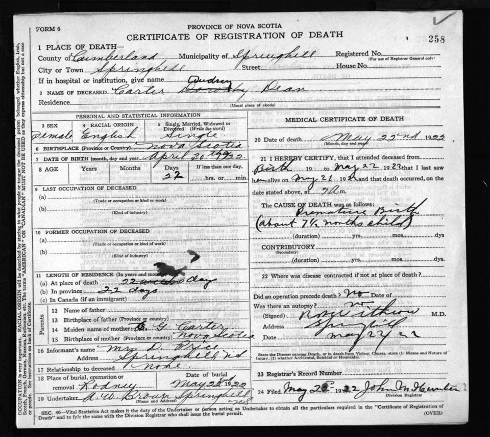 Death Registration: Year: 1922 file: 65 number: 258
