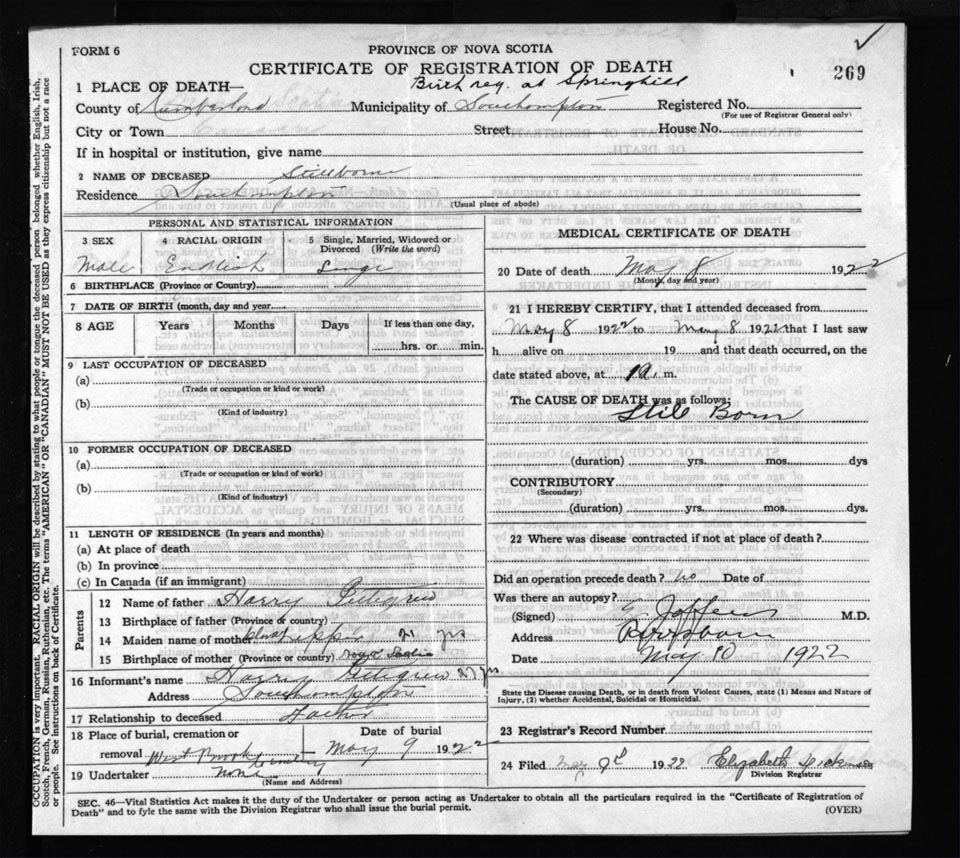 Male Death Registration: Year: 1922 file: 65 number: 269