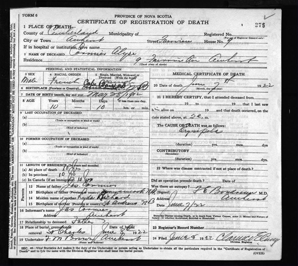 Death Registration: Year: 1922 file: 65 number: 276