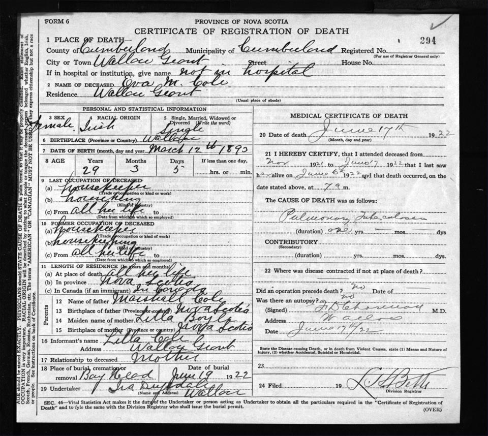 Death Registration: Year: 1922 file: 65 number: 294