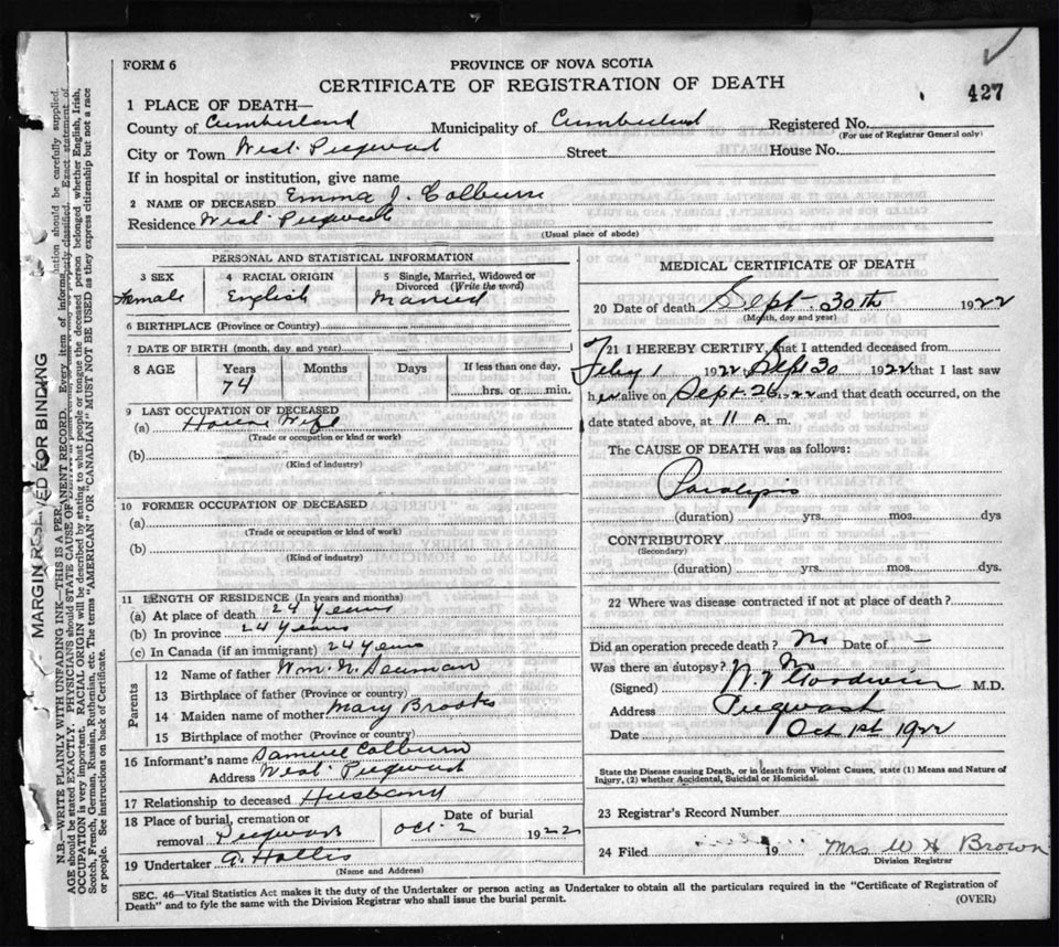Death Registration: Year: 1922 file: 65 number: 427
